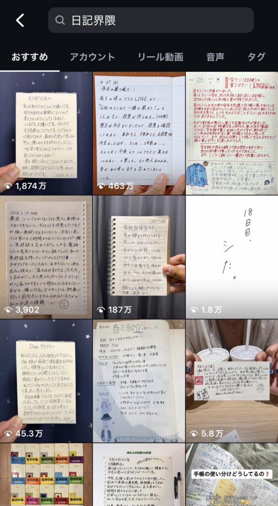 日記界隈とはZ世代の若者たちが手書きの日記を写真に撮り、InstagramなどのSNSへ投稿して楽しむ文化のことです。「#日記界隈」で検索すると、温かみのある手書きの投稿がたくさん見つかります。